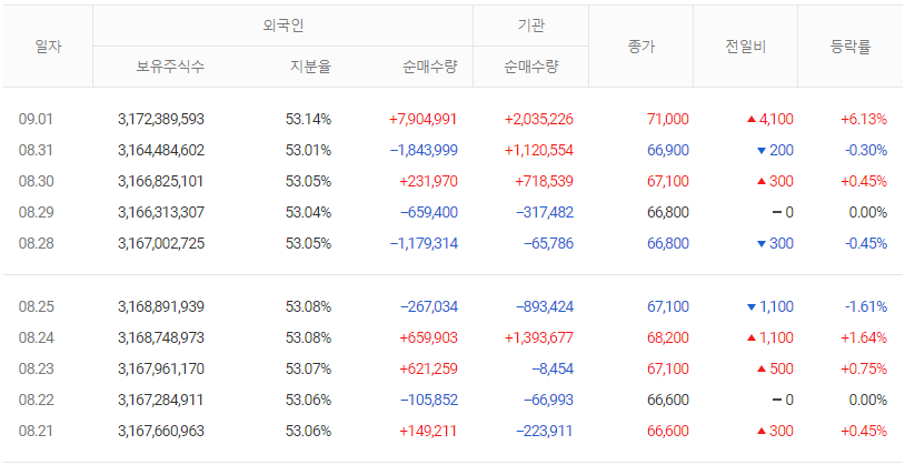 외국인과 기관에서도 삼성전자 주가의 흐름에 영향을 미치는 요인이 되기도 합니다. 지난 일주일 외국인은 물론 기관에서도 삼성전자를 거량 매수한 것으로 확인된다고 합니다.