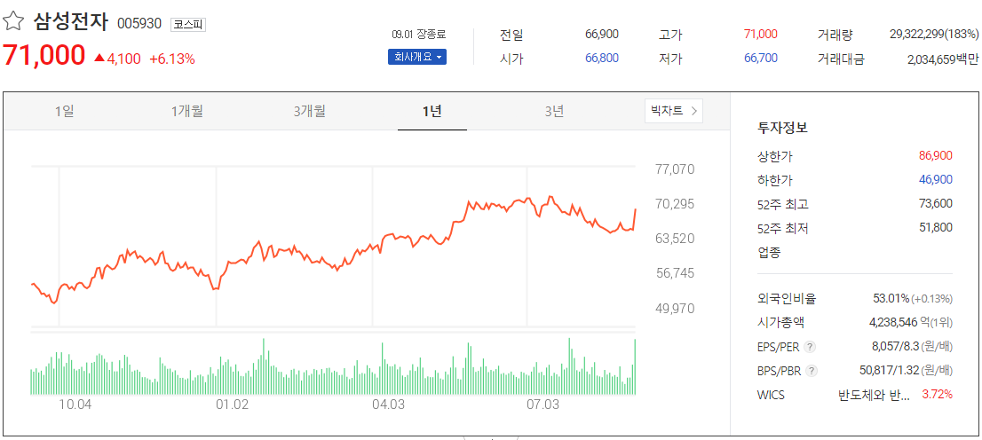 코로나 저점 향후 주가는 2021년 반도체 호황과 9만 전자 이상의 유동성 유입 기대감으로 전망됩니다. 때문에 6만 원 밑으로 내려갔던 주가는 다시 회복세를 보이며 있고요. 지난 7월 하락했던 주가는 6개월 넘게 박스권을 형성하며 횡보하고 있다고 합니다.