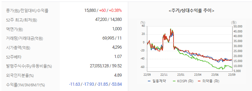 2022년 4월 최고가 79,500원이었던 일동제약 주가는 지난 7월 최저가 14,380원이었습니다. 보유하고 있는 주식의 존재마저 희미해져가고 있을 정도였습니다. 그런데 일동제약의 신약물질이 임상 시험 계획 승인을 취득한 후 본격적인 개발이 시작되었다는 소식이 전해지면서 주가는 상한가를 기록하게 됩니다. 일동제약 주가 전망 식약처 IND 승인 취득 일동제약 주가 분석에 대해 알아보도록 하겠습니다.