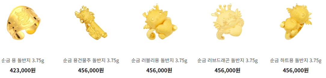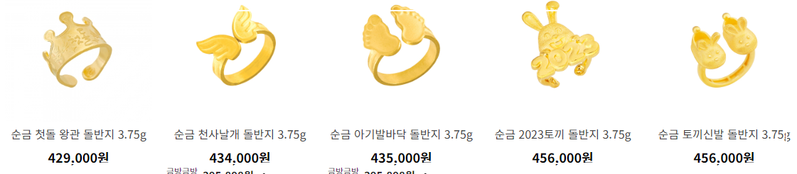 순금의 무게는 동일하지만 다자인에 따라 약간씩 가격의 차이가 있습니다. 대부분 돌반지를 구매할 때는 그해 띠에 맞는 동물을 선택하는 경우가 많습니다. 하지만 요즘은 그것과 상관없이 여자 아이나 혹은 남자 아이인지에 따라 디자인을 선택하기도 합니다.